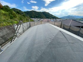 下地の防水性能を高めるため、粘着層付きの改質アスファルトルーフィングを全面にわたり丁寧に施工しました。安全に確実な施工が可能な材料で、屋根全体をしっかりと保護する防水層が形成されています。