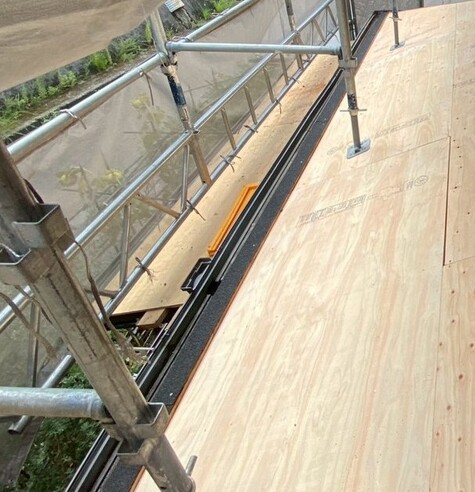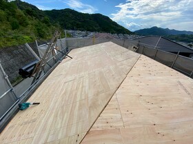 既存下地の補強を目的として、厚さ12mmの構造用合板を上から重ね張りし、屋根全体の強度と安定性を高めました。これにより、今後の屋根仕上げ材の施工に適した、しっかりとした下地が確保されています。